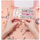 Ten wysokiej jakości kuferek do przechowywania elementów biżuterii, w zestawie z bogatym kompletem akcesoriów, wyróżnia się solidną konstrukcją i przemyślanym designem, który ułatwia organizację i inspiruje do tworzenia. Zawiera praktyczne przegródki na zawieszki, charmsy i gotowe bransoletki, umożliwiając łatwe układanie i wyjmowanie elementów, co zapewnia niezawodne wsparcie dla codziennych sesji twórczych.