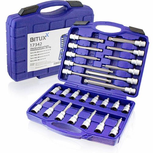 26-częsciowy zestaw gniazd BITUXX. Wykonany z wytrzymałej i odpornej stali chromowo-wanadowej.