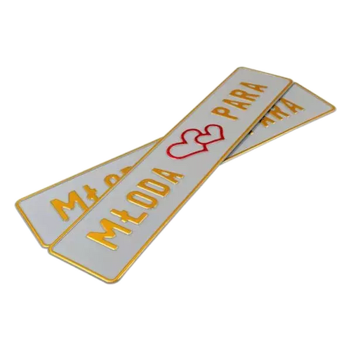 Tablice ślubne w bardzo modnym białym kolorze tłoczymy z wysokiej jakości aluminium. Ramkę i napis „MŁODA PARA” wykonaliśmy w kolorze złotym.