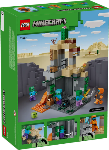 Oto 21587 – LEGO® Minecraft® Zombie Dungeon, zestaw pełen akcji, przygód i strachów w mrocznym lochu. Zanurz się w **świat Minecrafta** z unikalną estetyką **desert biome**, podziemną architekturą i postaciami prosto z gry. Odważny **Wastelands Wanderer**, uzbrojony w **diamond pickaxe**, **mace** i pełną zbroję **netherite**, staje naprzeciw trzem przerażającym **zombie**, w tym jednego z **enchanted leggings i złotym mieczem**, a także jednego z **diamentowym hełmem**. W środku lochu jest **obracana komnata rodząca zombie** oraz ruchoma ściana, która wywołuje **spadające głazy** – idealna do zabawy i odgrywania scen.