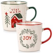 Zestaw 2 kubków świątecznych - Zestaw dwóch kubków z uchem do picia napojów, świetnie sprawdzą się w codziennym użytku. Kubki mają pojemność maksymalną 350 ml i wymiary 12 x 9 x 9 cm. Kubki ozdobione są świątecznymi napisami i dekorem ('JOY', 'STAY WARM'). Idealne do picia herbaty, kawy, kakao oraz innych napojów.