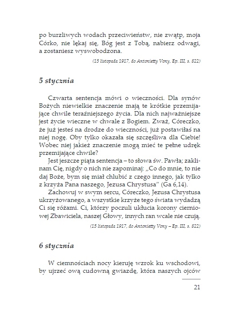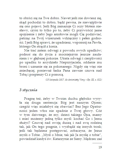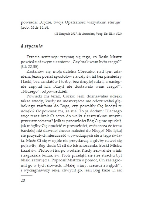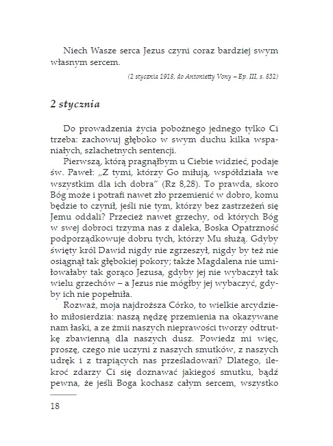Teksty zawarte w tej książce pochodzą z bardzo osobistych pism o. Pio – z jego listów do przyjaciół i osób, dla których był duchowym przewodnikiem. Te krótkie rozważania i rady o. Pio trafiają wprost do serca czytelnika i mówią mu o Bogu. Pulsuje w nich energia świętego, który pragnie pomagać ludziom prowadzić życie autentycznie chrześcijańskie i szczęśliwe. Książka ta przeznaczona jest dla wszystkich: świeckich, kapłanów, zakonników, niewierzących, dla ludzi doświadczonych życiowo jak również dla młodych, którzy dopiero szukają swojej życiowej drogi.