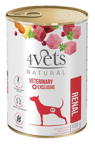 4Vets Renal to specjalistyczna dieta weterynaryjna opracowana z myślą o psach cierpiących na chroniczną lub przewlekłą niewydolność nerek. Karma ta wspomaga funkcjonowanie nerek, zapobiegając ich nadmiernemu obciążeniu, dzięki obniżonej zawartości fosforu i sodu oraz ograniczonej podaży wysokiej jakości białka. Zawartość kwasów tłuszczowych Omega-3 i Omega-6 przyczynia się do hamowania procesów zapalnych w organizmie, co jest szczególnie istotne w przypadku zapalenia nerek.