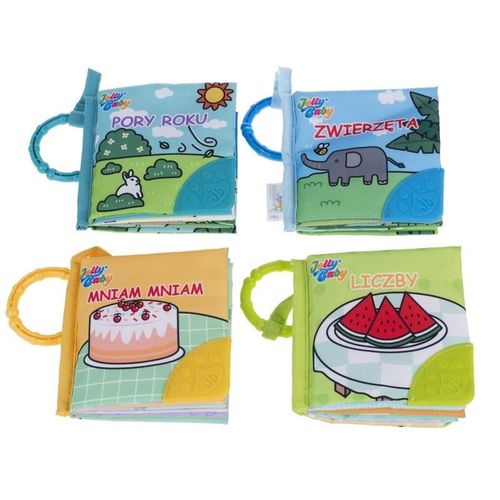 - w zestawie 4 książeczki (mniam mniam, liczby, zwierzęta i pory roku), każda wyposażona w kółeczko do zawieszania w wybranym miejscu oraz gryzak na okładce