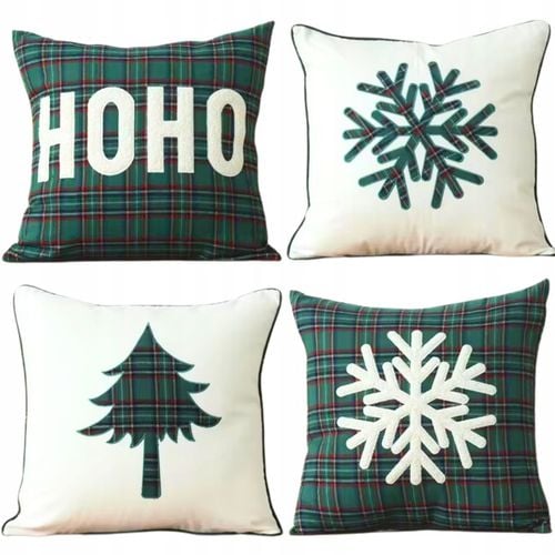 Zestaw obejmuje cztery poszewki o rozmiarze 45x45 cm, każda z wyjątkowym, jednostronnym nadrukiem. Śnieżynki, choinki i napisy w świątecznych kolorach ecru i zieleni wprowadzą do Twojego wnętrza niepowtarzalny, świąteczny klimat.