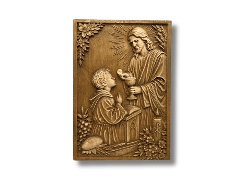 Przedstawiamy płaskorzeźbę stworzoną z myślą o dziewczynkach – subtelny i pełen ciepła wizerunek Jezusa i chłopca wykonany w twardym drewnie. To wyjątkowy prezent, który będzie towarzyszyć dziecku przez lata, stanowiąc piękną dekorację pokoju i przypominając o tym ważnym dniu.