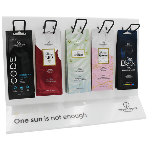 Ekspozytor wykonany z wytrzymałego tworzywa sztucznego z pięcioma metalowymi haczykami. Biały, z logo producenta. Przeznaczony dla pięciu produktów w saszetkach.