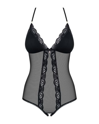 Obsessive 841-TED-1 body jest niezwykle pikantne i kuszące. Wygodny fason jest jednocześnie seksowny. Bieliznę wykonano z prześwitującej siateczki i bardzo kobiecej koronki, najwyższej jakości. Takie połączenie idealnie zaprezentuje się na Tobie, podkreślając wszystkie wdzięki. Miseczki są delikatnie usztywniane, dzięki czemu piersi będą podkreślone, a ich kształt jeszcze bardziej uwydatniony. Body możesz bezproblemowo dopasować do swoich rozmiarów dzięki regulowanym, krzyżującym się na plecach szelkach. Biżuteryjne ozdoby bez dodatku niklu umieszczone na szelkach i pod biustem idealnie pasują do całości, podkreślając jej figlarny charakter. Kokardki z przodu i nad pośladkami są delikatne. Bielizna dodatkowo posiada pikantny, odkryty krok z regulowanymi paseczkami oraz odkryte pośladki. Ten ostry detal zachęci Was do eksperymentów.
