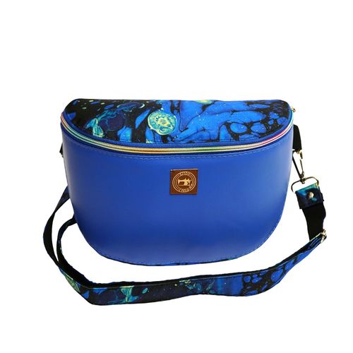 Model łączy wytrzymałą ekoskórę z poliestrem o intensywnym, abstrakcyjnym wzorze typu pouring, gdzie mieszają się odcienie niebieskiego, zieleni, czerni i żółci. Półcylindryczny kształt sprawia, że torebka idealnie dopasowuje się do sylwetki, a pasek z tym samym wzorem dodaje jej spójności i stylowego charakteru.
