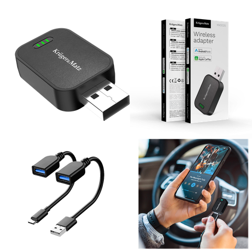 Adapter Kruger&Matz to kompaktowe i nowoczesne rozwiązanie, które pozwala zmienić każdy samochód w centrum multimedialnej rozrywki. Dzięki niemu połączysz smartfona z systemem Android Auto lub Apple CarPlay bez kabli, zachowując pełną wygodę i bezpieczeństwo podczas jazdy.