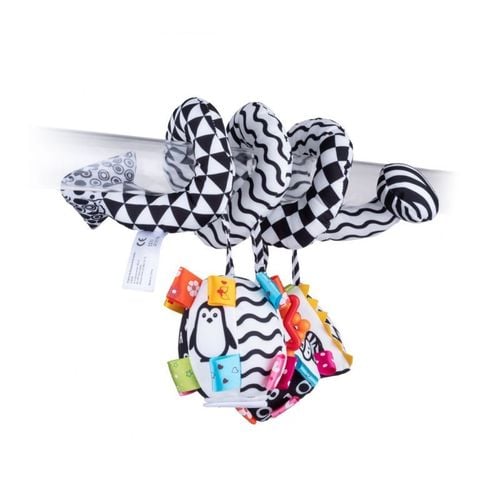 Kontrastowa spirala w magiczny sposób łączy walory rozrywkowe i edukacyjne, zapewniając Pluszakom Luzakom wspaniałą zabawę! Aż roi się tu od niespodzianek. Kontrastowe kolory pobudzają zmysł wzroku malucha, a zróżnicowane faktury materiałów, zmysł dotyku. W pluszakowych kształtach, piłce, kostce i piramidce, kryją się dzwoneczki, a piłkę dodatkowo zdobi bezpieczne lustereczko do samopoznania bobaska. Doczepiane do spirali gryzaczki przyniosą ulgę ząbkującym dzieciom. Spiralę bez trudu można owinąć wokół szczebelka łóżeczka.