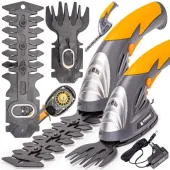 Nożyce są wyposażone w ergonomiczny uchwyt pokryty okładzinami antypoślizgowymi, co zapewnia bezpieczeństwo i wygodę podczas użytkowania. Dodatkowo, zestaw zawiera ostrze do trawy o szerokości 83 mm oraz ostrze do krzewów o długości 120 mm, które można łatwo zamienić za pomocą systemu beznarzędziowego.