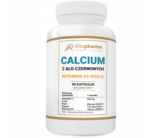 Altopharma Calcium z alg czerwonych to innowacyjny suplement diety w formie kapsułek, który wykorzystuje naturalne minerały morskie pochodzące z alg czerwonych Aquamin® F. Produkt został stworzony z myślą o wsparciu zdrowia układu kostnego, ale także o kompleksowej ochronie organizmu na co dzień. Każda kapsułka zawiera 800 mg minerałów morskich, w tym 256 mg wapnia i 17,6 mg magnezu, które są niezbędne dla utrzymania mocnych kości i zdrowych zębów.