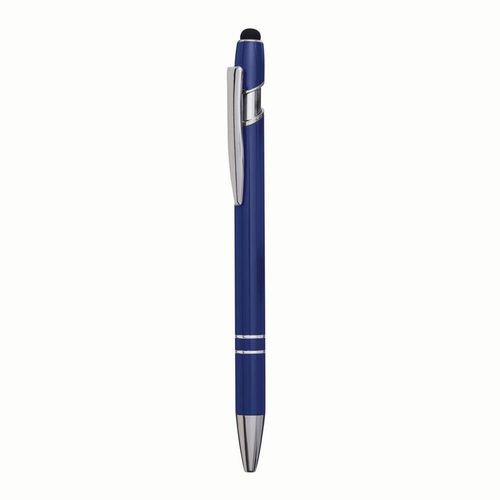 Aluminiowy długopis MERCHANT: z błyszczącą metalową obudową, mechanizmem na przycisk, gumowaną końcówką do ekranów dotykowych, niebieskim wkładem
