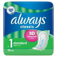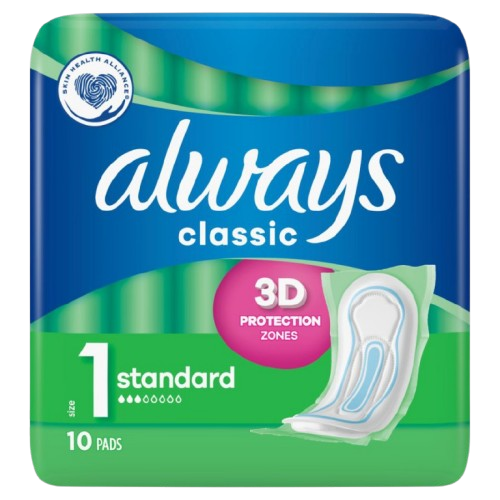 🧴 Opakowanie i formuła 1 opakowanie zawiera 10 sztuk podpasek Always Classic Standard (rozmiar 1).