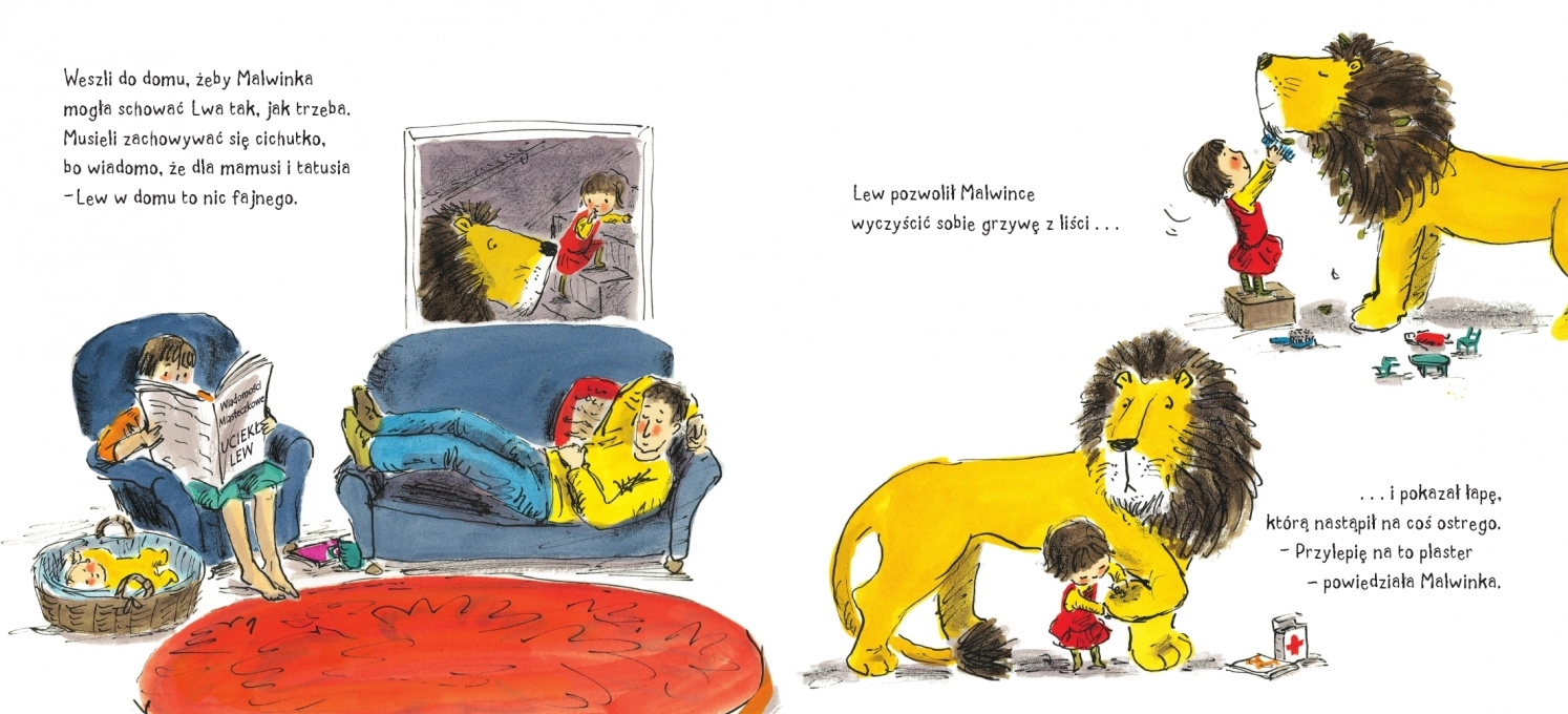 Ciepła, pięknie ilustrowana, zabawna seria o wyjątkowej przyjaźni małej dziewczynki i wielkiego Lwa, przetłumaczona na 25 języków, obsypana międzynarodowymi prestiżowymi nagrodami. Tom 1 Pewnego dnia w miasteczku pojawił się Lew, żeby kupić sobie kapelusz... Mieszkańcy się przerazili. Wszyscy... oprócz Malwinki. Ale jak bardzo mała dziewczynka może schować bardzo dużego Lwa? I jak przekonać rodziców, by pozwolili mu zamieszkać w domu? A może Lew jej pomoże? Bo przecież przeciwności trzeba pokonywać... Seria „Jak schować Lwa” niesie krzepiące, radosne przesłanie, że ten, kto ma pozytywny cel i chce pomagać innym, nie powinien zważać na przeszkody, bo jego starania prędzej czy później przyniosą rezultaty i zostaną docenione. Dzieci uwielbiają tę serię: cieszą się, bawią i wzruszają. Podziwiają piękne, oryginalne, wyraziste ilustracje i żywe kolory. Kibicują rezolutnym bohaterom w wyszukiwaniu i wymyślaniu kolejnych kryjówek przed rodzicami, przed nauczycielką, przed babcią i przekonują się, że to jest dobry Lew, który chce wszystkim pomagać i chroni Malwinkę.