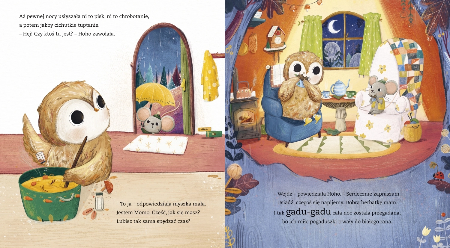 Nowa, olśniewająca zachwycającymi ilustracjami, mądra, urocza, zabawna i wzruszająca, pięknie rymowana książka nagradzanych, wydawanych w 30 krajach autorek o przezwyciężaniu lęku przed nieznanym. Zainspirowana światowym bestsellerem Odwagi, zajączku. Sówka Hoho kocha swój dom. Tylko tu czuje się bezpiecznie. Tu jest przytulnie i ciepło. A Hoho nie lubi ani deszczu, ani burzy. Boi się ciemności, bo tam może czaić się niebezpieczeństwo. Aż pewnego wieczoru zjawia się niespodziewany gość: mała myszka Momo. Hoho zaprasza ją na herbatkę. Odtąd stają się najlepszymi przyjaciółkami. Ale kiedy Momo proponuje jej spacer, Hoho odmawia, bo nadal boi się wyjść na zewnątrz. Czy zdarzy się coś, co sprawi, że mała sówka pokona lęk przed nieznanym, rozwinie skrzydła i wyfrunie z domu? A może nawet przekona się, jak bardzo jest odważna?