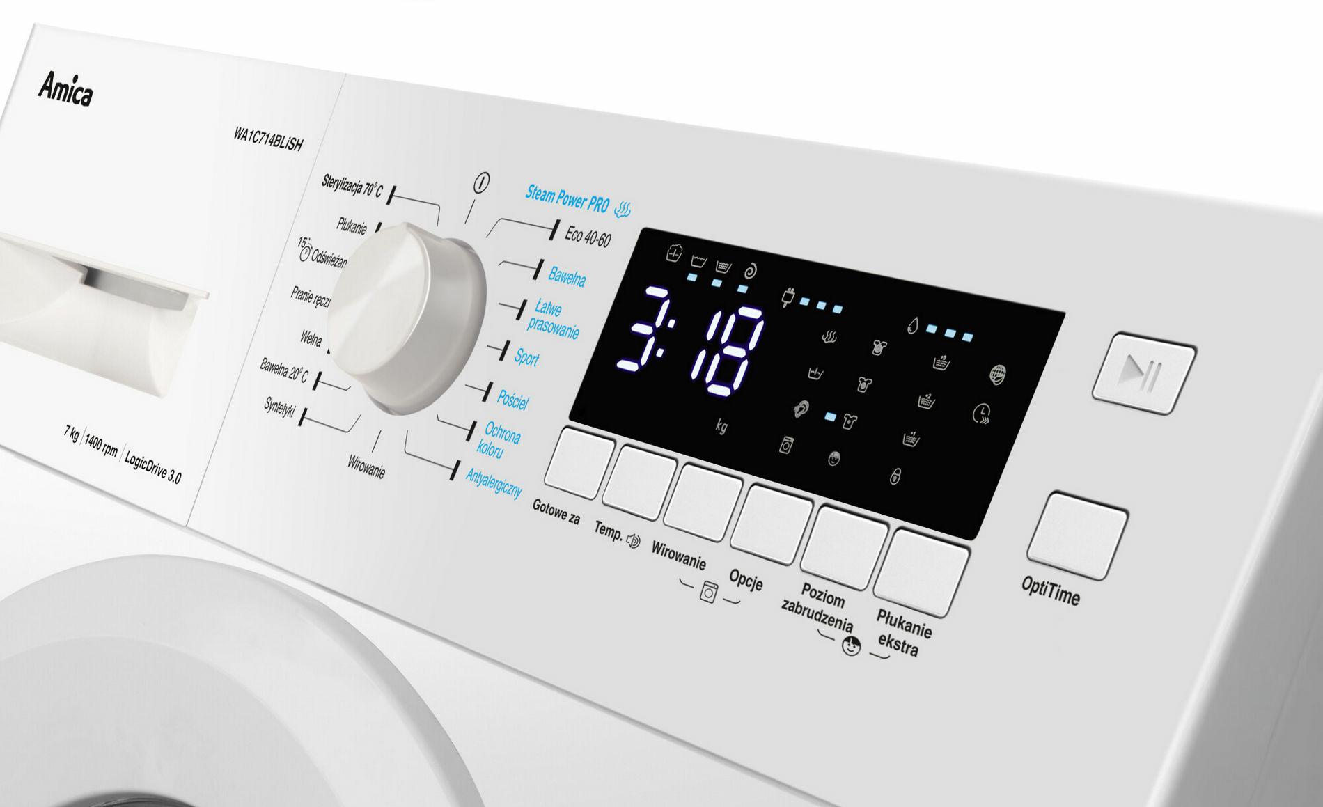 AMICA PRALKA WA1C714BLISH oferuje 16 programów prania, w tym opcje dedykowane odzieży sportowej, alergikom, bawełnie, wełnie, syntetykom, praniu ręcznemu, sterylizacji, odświeżaniu, ochronie kolorów, łatwemu prasowaniu, samoczyszczeniu, pościeli, płukaniu, bawełnie w 20°C oraz program ekologicznym 40-60.