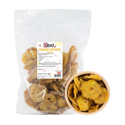 Opakowanie zawiera 1 kg ananasa suszonego w plastrach.