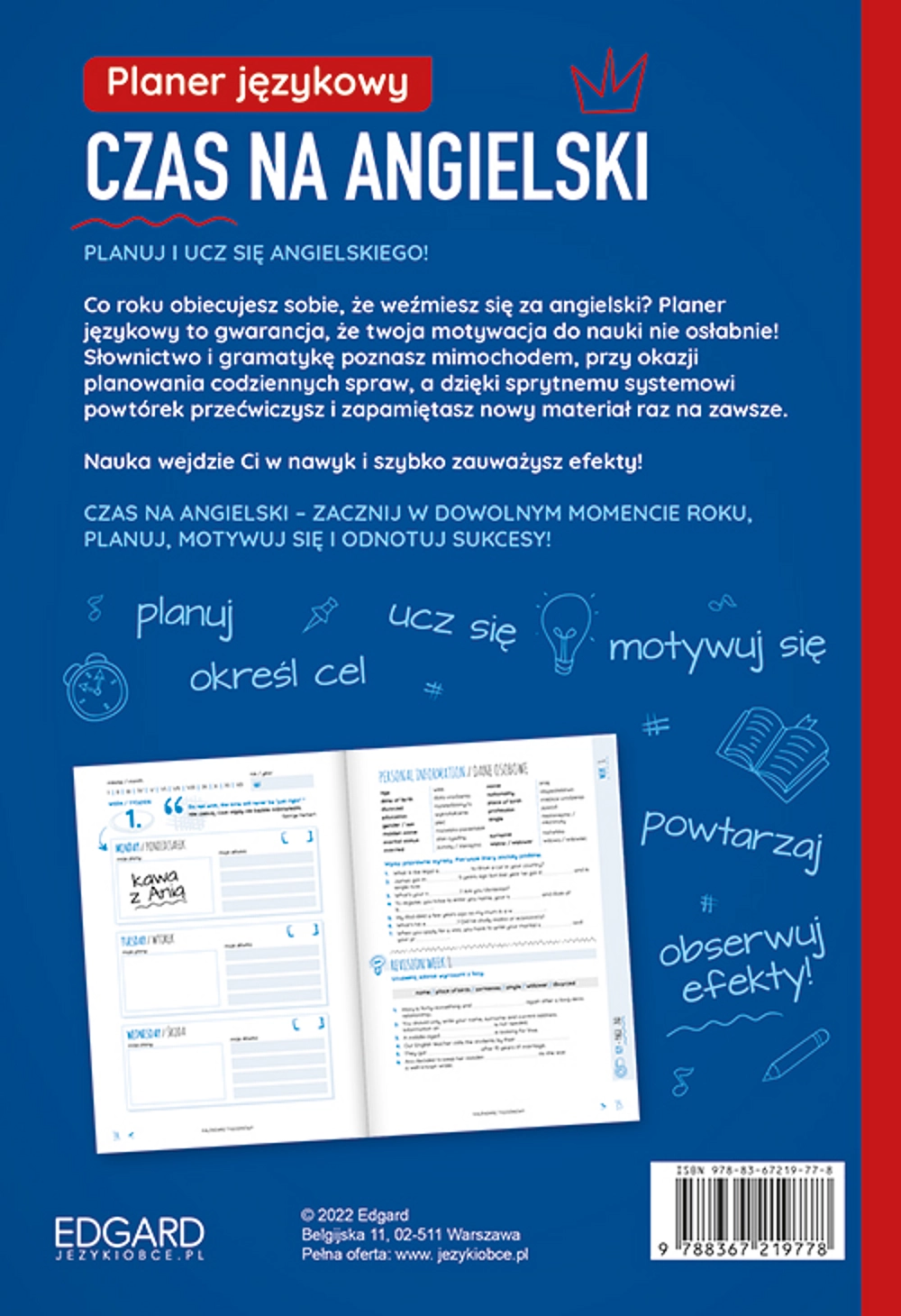 Planer językowy. Czas na angielski to wyjątkowa propozycja dla osób, które chcą połączyć naukę angielskiego z codziennym planowaniem, inspirowaniem i realizacją celów. Wykorzystanie metody wiecznego kalendarza pozwala rozpocząć korzystanie z niego w dowolnym momencie, bez konieczności czekania na konkretną datę. Materiał dostosowany jest do początkujących użytkowników języka angielskiego, na poziomie A2-B1, szukających motywacji, natchnienia i pomysłów do dalszej nauki. Już dzisiaj rozpocznij rok regularnej nauki języka angielskiego! Skończ z wymówkami i nie czekaj na nowy tydzień, rok czy specjalną okazję. Ucz się nowego słownictwa i gramatyki oraz ćwicz pamięć w potrójnym systemie powtórek i sprawdzaj wiedzę w testach podsumowujących materiał z kilku tygodni. Nauka wejdzie ci w nawyk i szybko zauważysz pozytywne rezultaty swoich działań. Podział na małe porcje materiału przeznaczone do codziennej nauki sprzyja przyswajaniu materiału i szybszemu zapamiętywaniu. Podręczny format ułatwia korzystanie z planera w każdej wolnej chwili – w drodze do szkoły czy pracy, w domu, w podróży – można go zabrać ze sobą wszędzie. Kalendarz z podziałem tygodniowym i miesięcznym świetnie sprawdzi się również do prywatnego planowania. Dostosuj planer do własnych potrzeb w strefie wolnej twórczości – pisz pamiętnik, opowiadania i rysuj mapy myśli. Korzystaj ze strefy geograficzno-kulturowej – zbieraj inspiracje, zapisuj ciekawostki oraz terminy spotkań. Sprawdź nowoczesną metodę nauki, motywuj się, realizuj językowe cele krok po kroku i obserwuj efekty! Planer językowy. Czas na angielski to: • nauka języka na poziomie A2-B1roczny plan językowy, • możliwość rozpoczęcia nauki w dowolnym momencie, • podział na układ tygodniowy i miesięczny, • słownictwo i gramatyka, • potrójny system powtórek, • testy sprawdzające znajomość materiału, • cytaty i hasła motywujące, • strefa wolnej twórczości (pisz pamiętnik, opowiadania, rysuj mapy myśli), • strefa geograficzno-kulturowa (zapisuj ciekawostki, zbieraj inspiracje), • pomoc w określeniu celów językowych i realizacji.