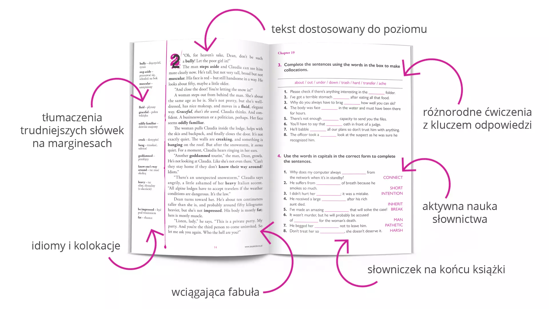Czytaj mrożący krew w żyłach kryminał i ucz się angielskiego! W czasie śnieżycy w Alpach młoda policjantka znajduje schronienie w pensjonacie. Święta spędza w nim amerykański milioner ze swoimi bliskimi. Nikt jeszcze nie wie, że za chwilę dojdzie tu do zbrodni. Powiało chłodem w nauce angielskiego? A może wręcz przeciwnie – gorączkowo szukasz nowych wyzwań, żeby podtrzymać dobrą passę do nauki? Niezależnie od motywacji, jeśli jesteś już na poziomie średnio zaawansowanym, możesz znacząco ożywić swój sposób nauki. Odkryj kryminał z ćwiczeniami do nauki angielskiego i zobacz, jak ciekawa książka może aktywować wiedzę, którą już masz i równocześnienauczyć cię zupełnie nowych słów i struktur dopasowanych do poziomu B1-B2. Usiądź wygodnie, zanurz się wzimowej scenerii Alp, czytaj wciągającą historię i ucz się angielskiego przy okazji, nie tylko od święta. Jeśli chcesz, możesz także wziąć nasz kryminał ze sobą do plecaka czy torebki – wygodny format umożliwi ci czytanie bez wysiłku, kiedy akurat masz czas iochotę. Sprawdź, jak to działa. Zagłębiasz się we wciągającej historii dostosowanej do poziomu osób uczących się języka angielskiego na poziomie średnio zaawansowanym (B1-B2), sprawdzasz znaczenie najważniejszych i najtrudniejszych słówek, które są na wyciągnięcie ręki – umieszczone na marginesach, i czujesz dreszczyk emocji, rozwiązując mrożącą krew w żyłach zagadkę kryminalną. W naturalny sposób przyswajasz konstrukcje leksykalno-gramatyczne, wzbogacasz słownictwo oraz rozwijasz umiejętność czytania ze zrozumieniem, wykonując różnorodne ćwiczenia podczas lektury. A swoje odpowiedzi sprawdzasz w kluczu na końcu książki. Czytaj kryminał do nauki angielskiego i… • poznaj zabójczo wciągającą świąteczną historię z dreszczykiem, • sprawdzaj znaczenie słówek, nie odrywając się od lektury dzięki tłumaczeniom namarginesach, • poznaj angielskie słownictwo na poziomie średnio zaawansowanym B1-B2, • kontroluj stopień zrozumienia tekstu, • rozwiązuj aż 90 urozmaiconych ćwiczeń leksykalnych i gramatycznych.