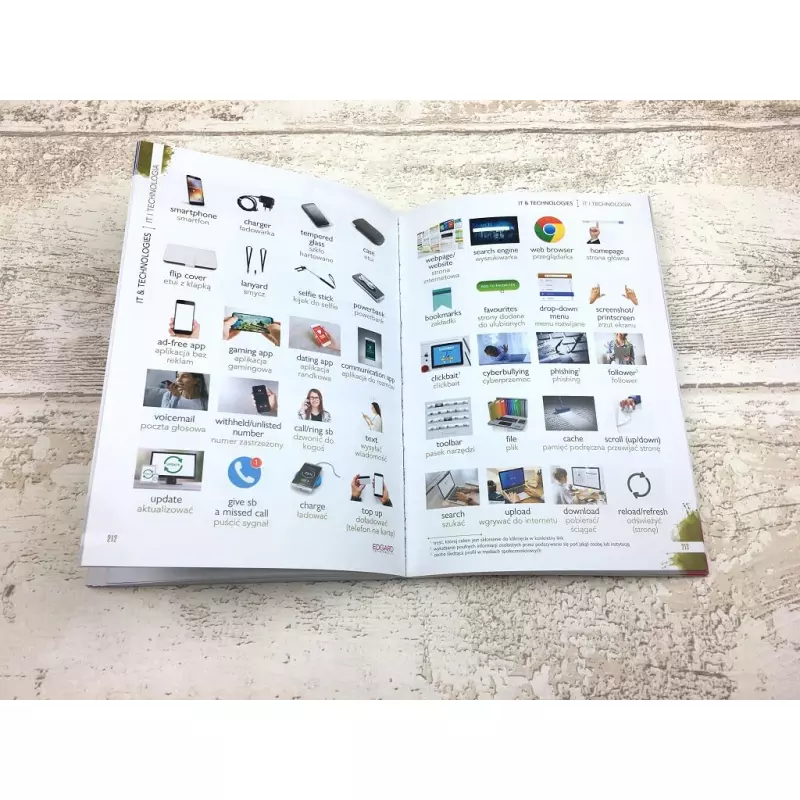 Poznaj angielski od podstaw i ucz się słówek metodą wizualną! Angielski. Słownik w obrazkach to niezbędnik dla osób nie przepadających za tradycyjnymi słownikami. Niemal każde hasło zostało opatrzone zdjęciem, grafiką lub schematem, co ułatwi i przyśpieszy zapamiętywanie słówek. Słownik przypadnie do gustu zarówno początkującym użytkownikom angielskiego, jak i osobom, które chcą poznać słówka na poziomie zaawansowanym. Rozpocznij naukę języka angielskiego ze Słownikiem w obrazkach i sprawdź, jak szybko pojawią się efekty! Dzięki niemu poznasz ponad 4000 haseł, które będziesz mógł wykorzystać w codziennych sytuacjach i swobodnej komunikacji. W książce znajdziesz 15 rozdziałów tematycznych: jedzenie, dom, praca, poruszanie się po mieście czy sport – to tylko niektóre z nich! Na końcu słownika skorzystasz z indeksu angielsko-polskiego, z podsumowaniem wszystkich pojęć, dzięki czemu błyskawicznie znajdziesz potrzebne słówko w każdej sytuacji. Korzystaj ze skutecznej metody wizualnej i poszerzaj zasób angielskiego słownictwa.