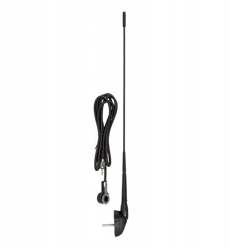 Wysokiej jakości antena radiowa przeznaczona do zamontowania na dachu samochodu, o długości masztu 44 cm.