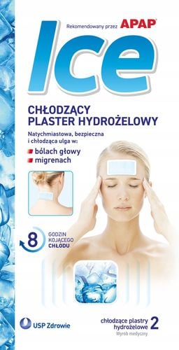 Chłodzący plaster hydrożelowy Apap Ice zawierający mentol - po przyklejeniu do skóry natychmiast chłodzi, przynosząc ulgę w bólach głowy i migrenach.