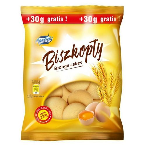 Mąka pszenna, cukier, masa jajowa 23%, emulgatory (E471, E475), skrobia ziemniaczana, syrop cukru inwertowanego, substancje spulchniające (E450(i), E500 (ii)), sól, aromat