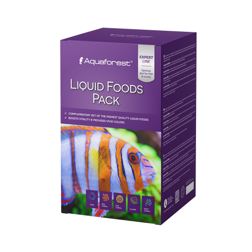 Komplet pokarmów płynnych zapewnia najwyższej jakości pokarm dla ryb i koralowców. Opakowanie zawiera cztery produkty opracowane na bazie wieloletnich doświadczeń akwarystycznych. Zestaw pozwala na skomponowanie optymalnej i zróżnicowanej diety dla organizmów wodnych.