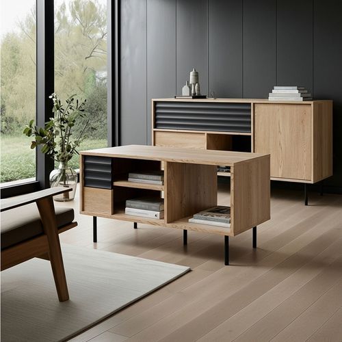 Meble z tej kolekcji wykonane są z płyty laminowanej w kolorze Dąb Cremona z frontami z tej samej płyty jak korpus i frontem ryflowanym z płyty mdf w kolorze Czarny Mat na nóżkach czarnych. Zaletą takich mebli jest na przykład: optyczne powiększenie przestrzeni i nowoczesny wygląd Kolor dębu nada wnętrzu naturalności a czarny front doda stylu. Dzięki zastosowaniu takiej kolorystyki meble te z łatwością wpasują się w wystrój każdego wnętrza. Przy produkcji wykorzystano wysokiej jakości płyty i akcesoria dzięki czemu meble są trwałe i solidne.