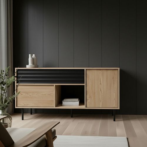 Komoda ARD-150 składa się z części frontowej zamykanej i otwartej (1drzwi, 1 klapa, 1 szuflada) Korpus mebla wykonany z matowej płyty laminowanej, front z płyty jak korpus i z płyty mdf oklejonej folią PVC , na nóżkach czarnych ((wys. nóżek 20 cm). We frontach czarny mat wykonano wyraźne frezowanie nadające głębi oraz elegancji dla całego mebla. Drzwi posiadają zawiasy z cichym domykiem.