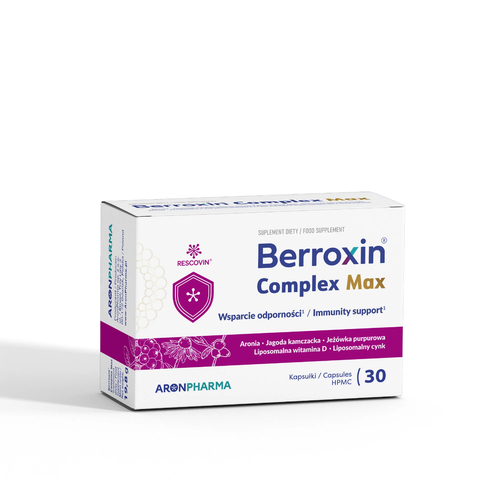 Suplement diety Aronpharma Berroxin ® Complex to wysokiej jakości produkt, który zawiera wyjątkową mieszaninę naturalnych substancji przeznaczonych dla każdego. W składzie znajdują się: Fenactive®, czyli ekstrakt z czarnego bzu (Sambucus nigra) oraz owoców aronii (Aronia melanocarpa), stanowiące bogactwo polifenoli i antocyjanów, witamina C, D, B6, cynk i selen.