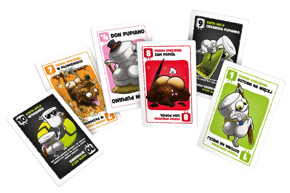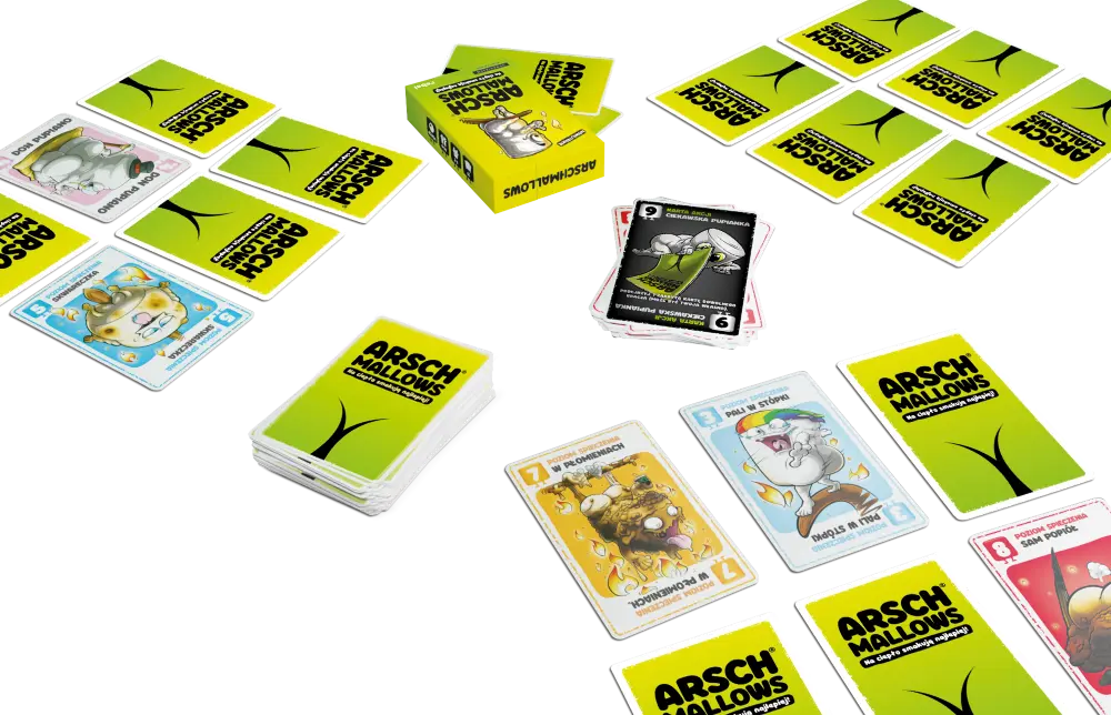 Na ciepło smakują najlepiej! Odkryj, jaką wartość punktową skrywają Twoje karty i użyj sprytu, aby zebrać najsmaczniejsze pupianki i zwyciężyć! Arschmallows to ekscytująca zabawa dla osób w każdym wieku. Toczy się przez 6 rund, podczas których naszym celem jest zebranie jak najmniejszej liczby punktów. Aby tego dokonać, będziemy starali się zapamiętać położenie poszczególnych kart i skutecznie je podmieniać. Zbierzcie się dookoła ogniska i przygotujcie się na świetną zabawę. Tylko niczego nie przypalcie! Na czym to polega? Na początku każdej rundy gracze otrzymują po 6 zakrytych kart i układają je przed sobą. Zanim zabawa się rozpocznie, możemy podejrzeć 2 z nich. Gracze rozgrywają kolejno swoje tury. Na początku dobieramy wierzchnią kartę z zakrytego stosu dobierania (i spoglądamy na nią) albo dobieramy wierzchnią kartę z odkrytego stosu kart odrzuconych. Następnie wykonujemy 1 z następujących akcji: Wymieniamy 1 ze swoich zakrytych kart na dobraną kartę (nie ujawniając jej). Odrzucamy dobraną kartę, a następnie odkrywamy 1 ze swoich kart – w ten sposób zostaje ona zablokowana do końca rozgrywki. Jeśli karta dobrana z zakrytego stosu dobierania okaże się kartą akcji, możemy wykonać opisaną na niej akcję albo kontynuować rozgrywkę, tak jak w przypadku akcji 1 i 2. Jeśli gracz na koniec swojej tury uważa, że ma najniższą liczbę punktów spośród wszystkich uczestników, może zakończyć rundę okrzykiem „Pupianki!”. Runda kończy się również wtedy, gdy jeden z graczy ma przed sobą same odkryte karty. W takim przypadku pozostali gracze mogą rozegrać po ostatniej turze. Osoba, która zakończyła rundę, musi mieć najniższą łączną liczbę punktów. Jeśli nie udało jej się tego osiągnąć, jej punkty zostają podwojone w ramach kary. Punkty zdobyte w poszczególnych rundach sumują się. Zwycięży osoba, która po skończeniu 6. rundy będzie miała ich najmniej.