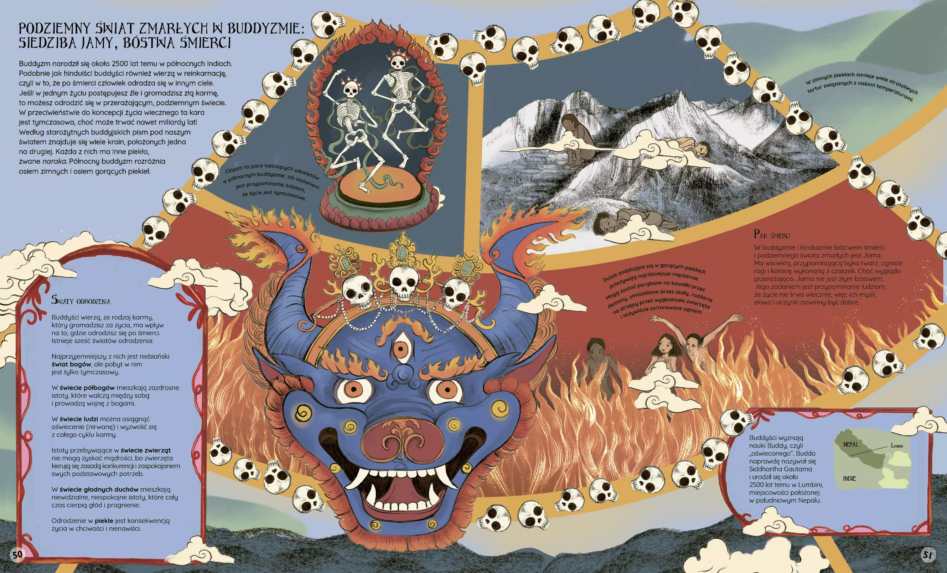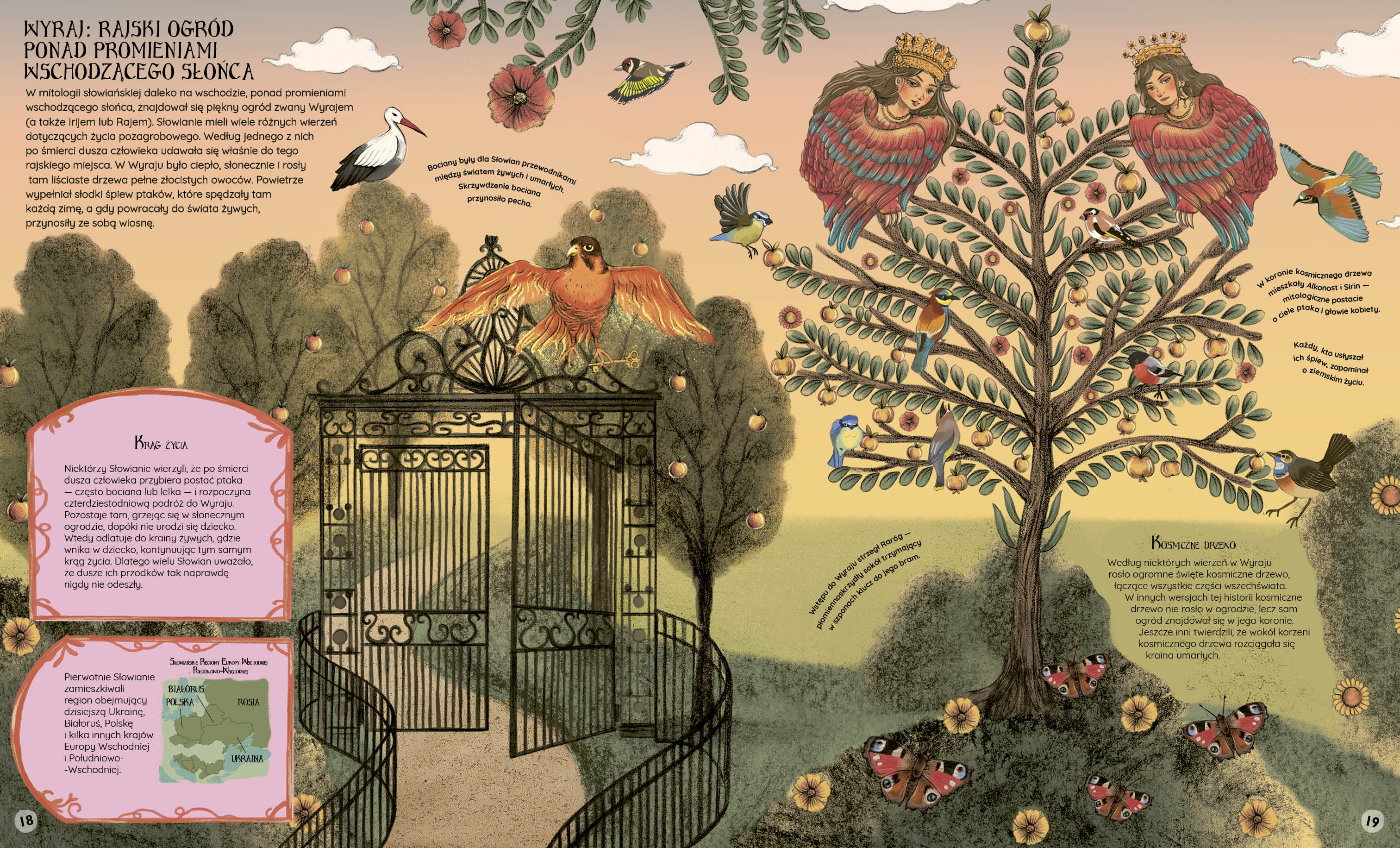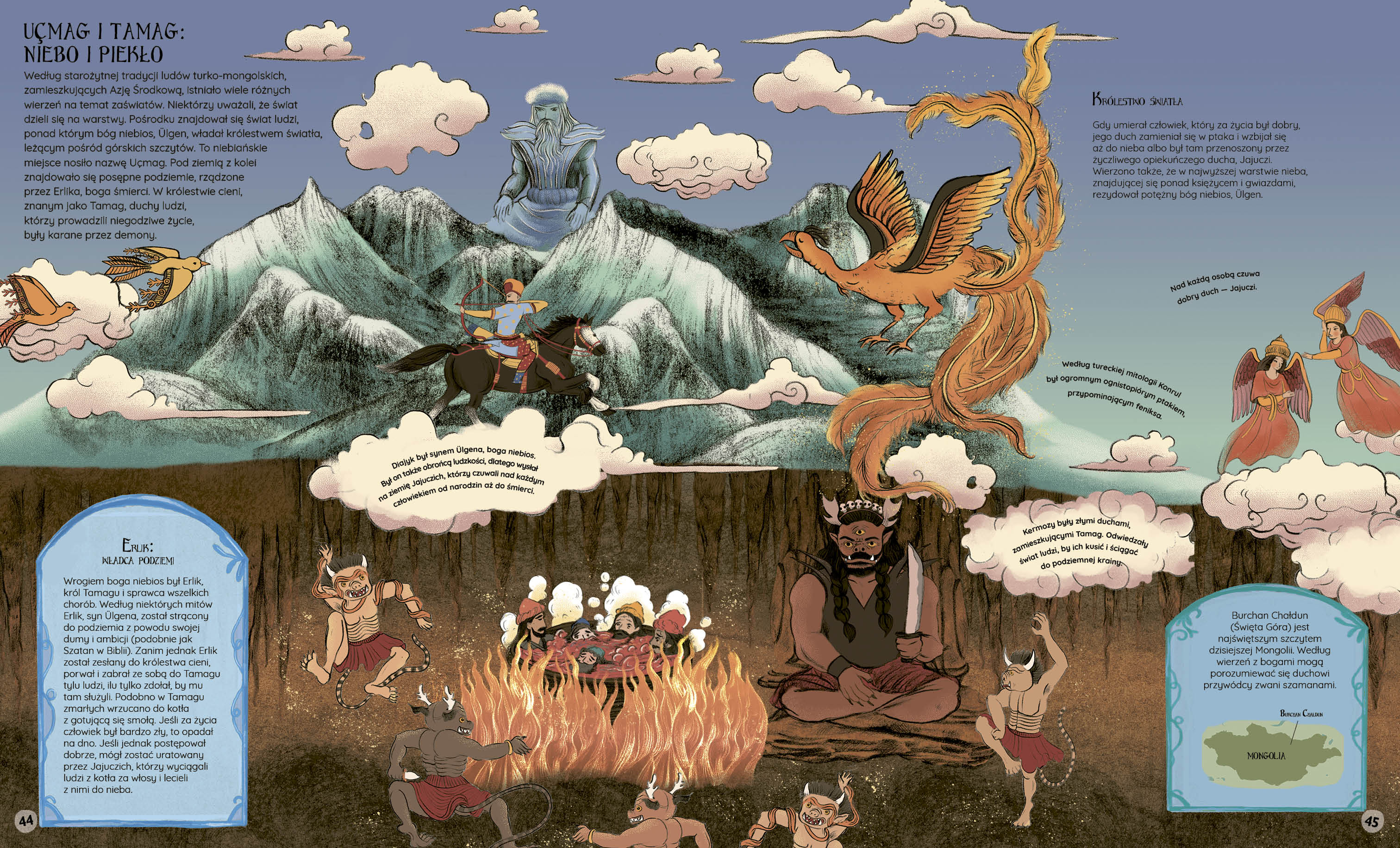 Dokąd trafiamy po śmierci? To trudne pytanie fascynuje ludzi od tysięcy lat. Próby udzielenia odpowiedzi na to pytanie podejmowała ludzkość od zarania dziejów – na wszystkich kontynentach i we wszystkich kulturach świata. Wyobrażenia na temat życia po śmierci stanowią nieodzowny i ważny element każdej mitologii, a wizje wieczności są nie tylko fascynującymi dowodami kreatywności i wyobraźni, ale pokazują również ludzką potrzebę duchowości i wyjścia poza powłokę cielesną. Niniejszy Atlas zaświatów jest pełnym szacunku dla ludzkich wierzeń przekrojowym spojrzeniem na życie pozagrobowe – piekło, niebo oraz to, co jest pomiędzy nimi. To niesamowita podróż do pozaziemskich światów: ognistych królestw, rajskich ogrodów, mrocznych wysp duchów, upiornych galeonów czy złotych komnat Walhalli. Malując wspaniałe wędrówki dusz, sąd ostateczny w starożytnym Egipcie, kult przodków czy mroczne królestwo Hadesa, autorzy odwoływali się zarówno do źródeł historycznych, jak i magicznych elementów folkloru.