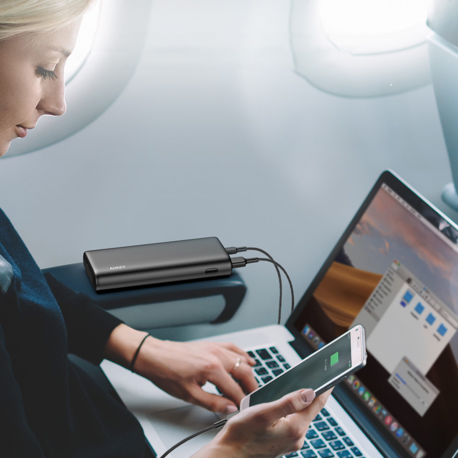 20 000 mAh Powerbank Aukey PB-Y37 obsługuje technologię Power Delivery, dzięki której przez kabel USB-C może zasilić baterie laptopa. Bateria w Twoim MacBooku, Elitebooku, ThinkPadzie czy jakimkolwiek innym sprzęcie ładowanym przez USB-C zostanie zasilona z mocą 65W!