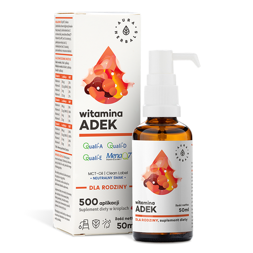 Suplement diety Aura Herbals Witamina ADEK dla rodziny MCT – krople to wysokiej jakości produkt, który łączy naturalne, rozpuszczalne w tłuszczach witaminy A, D, E i K. Olejowa baza z MCT z kokosa umożliwia prawidłowe wchłanianie witamin bez spożywania dodatkowych tłuszczów. Produkt ten nie zawiera żadnych substancji pochodzenia zwierzęcego, dlatego jest odpowiedni dla wegan i wegetarian.