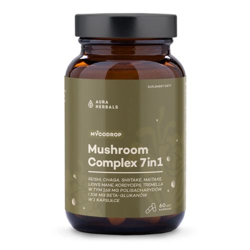 Mycodrop Mushroom Complex 7 w 1 od Aura Herbals to innowacyjny suplement diety w formie kapsułek, który łączy siedem starannie wyselekcjonowanych ekstraktów z owocników grzybów. Produkt został opracowany z myślą o osobach poszukujących naturalnych wsparć dla układu odpornościowego, wytrzymałości organizmu oraz ogólnej harmonii zdrowia. Bez dodatków, czysty i w 100% wegański i wegetariański, spełnia wysokie normy jakości, gwarantując bezpieczeństwo i skuteczność.