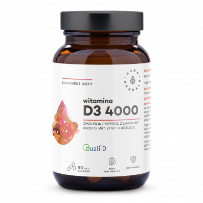 Aura Herbals Witamina D3 4000 IU (90 kapsułek) to suplement diety ze skoncentrowaną porcją witaminy D3 z lanoliny. W każdej kapsułce zamknięta jest certyfikowana witamina D – Quali-®D – charakteryzująca się doskonałą przyswajalnością i wysoką stabilnością. Suplement diety sprawdzi się nie tylko u osób, które pragną uzupełnić podaż tej substancji w codziennej diecie, ale także dla seniorów powyżej 75. roku życia oraz tych, u których stwierdzono deficyt witaminy D w organizmie. Warto też podkreślić, że produkt ten jest odpowiedni dla wegetarian, ponieważ składniki aktywne zostały zamknięte w kapsułce z celulozy roślinnej. Każda z nich zawiera 4 000 IU witaminy D.