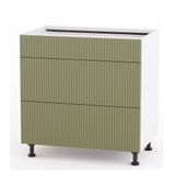 Korpus wykonany jest z płyty wiórowej laminowanej o grubości 18 mm z frontami z płyty MDF foliowanej, frezowanej. Wewnątrz znajdują się 3 szuflady. Korpus stoi na 4 nóżkach o regulowanej wysokości (w zakresie 9,5-16,5cm). Nóżki wykonane są z wytrzymałego tworzywa, mają one specjalny kształt umożliwiający jednoczesne podparcie boków i wieńca dolnego, co znakomicie poprawia wytrzymałość całej szafki. W zestawie dołączony jest kpl. klipsów umożliwiający montaż cokołu dolnego.