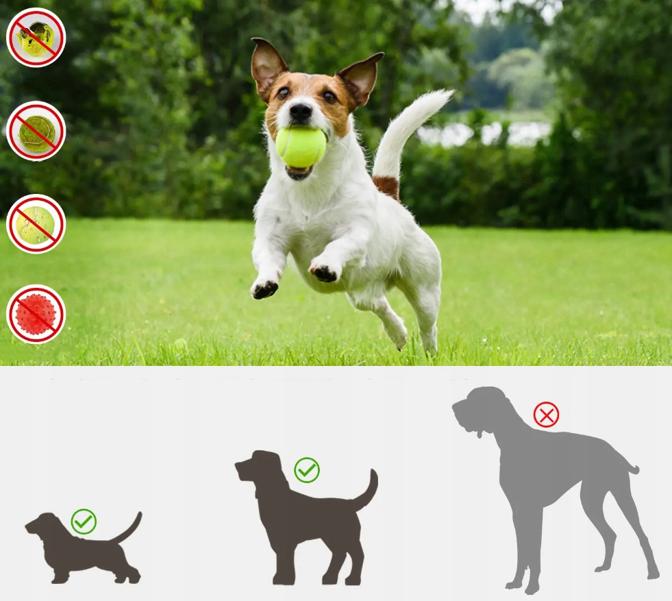 Wyrzutnia piłek działa jedynie z piłkami o średnicy 5 cm (+/- 1 cm). Są to mniejsze piłki niż tradycyjne piłki tenisowe, by zapewnić ich odpowiedni wyrzut oraz odległość, na jaką zostają wyrzucane piłki.