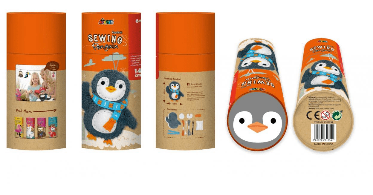 „Avenir Sewing” to wyjątkowa seria maskotek do samodzielnego uszycia. Brelok do kluczy pingwin ma ok. 15.0 cm wysokości i 12.0 cm szerokości. Jest bardzo miły w dotyku i mięciutki. W zestawie są wszystkie niezbędne rzeczy: przygotowany do zszycia materiał, wypełnienie, nici (mulina), plastikowa bezpieczna igła. Już przedszkolak poradzi sobie z samodzielnym uszyciem sobie breloczka dzięki bardzo przejrzystej obrazkowej instrukcji. „Avenir Sewing” to seria, dzięki której czas spędzony z dzieckiem na kreatywnej zabawie zaowocuje nie tylko fantastycznymi wspomnieniami i wzmocnieniem więzi, ale także... nową ukochaną zabawką!