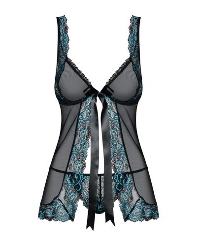 Obsessive Amanta babydoll – rozkoszny urok błękitnej koronki w postaci eleganckiej koszulki z rozcięciem. Całość wykonana jest z delikatnej siateczki w kolorze czarnym, ozdobionej na brzegach czarno-błękitną koronką o kwiatowym motywie. Koronka dekoruje także brzegi prześwitujących miseczek oraz ramiączka. Usztywniane fiszbinami miseczki połączone są ze sobą niezauważalnym zapięciem dodatkowo zamaskowanym satynową kokardą. Komplet nie byłby pełen, gdyby nie dołączone do kompletu stringi także ozdobione delikatną koronką. Ponad to Obsessive Amanta posiada regulowane ramiączka, co ułatwia jej dopasowanie do ciała. Amanta jest świetna dla Pań o średnim biuście i w miarę płaskim brzuszku. W składzie materiału znajdziemy 94% poliamid, 6% elastan.