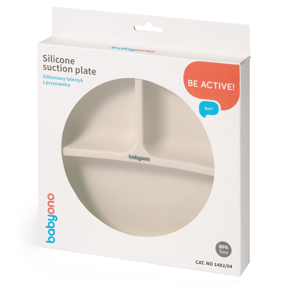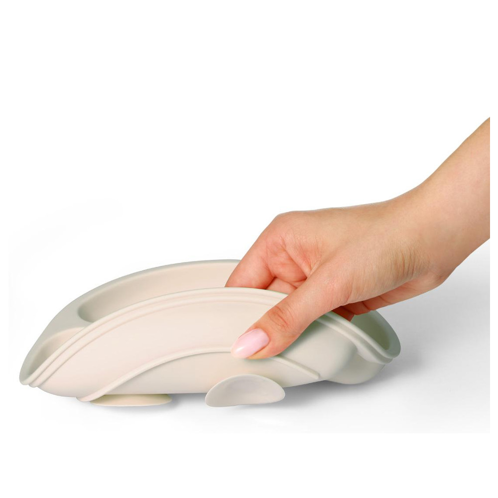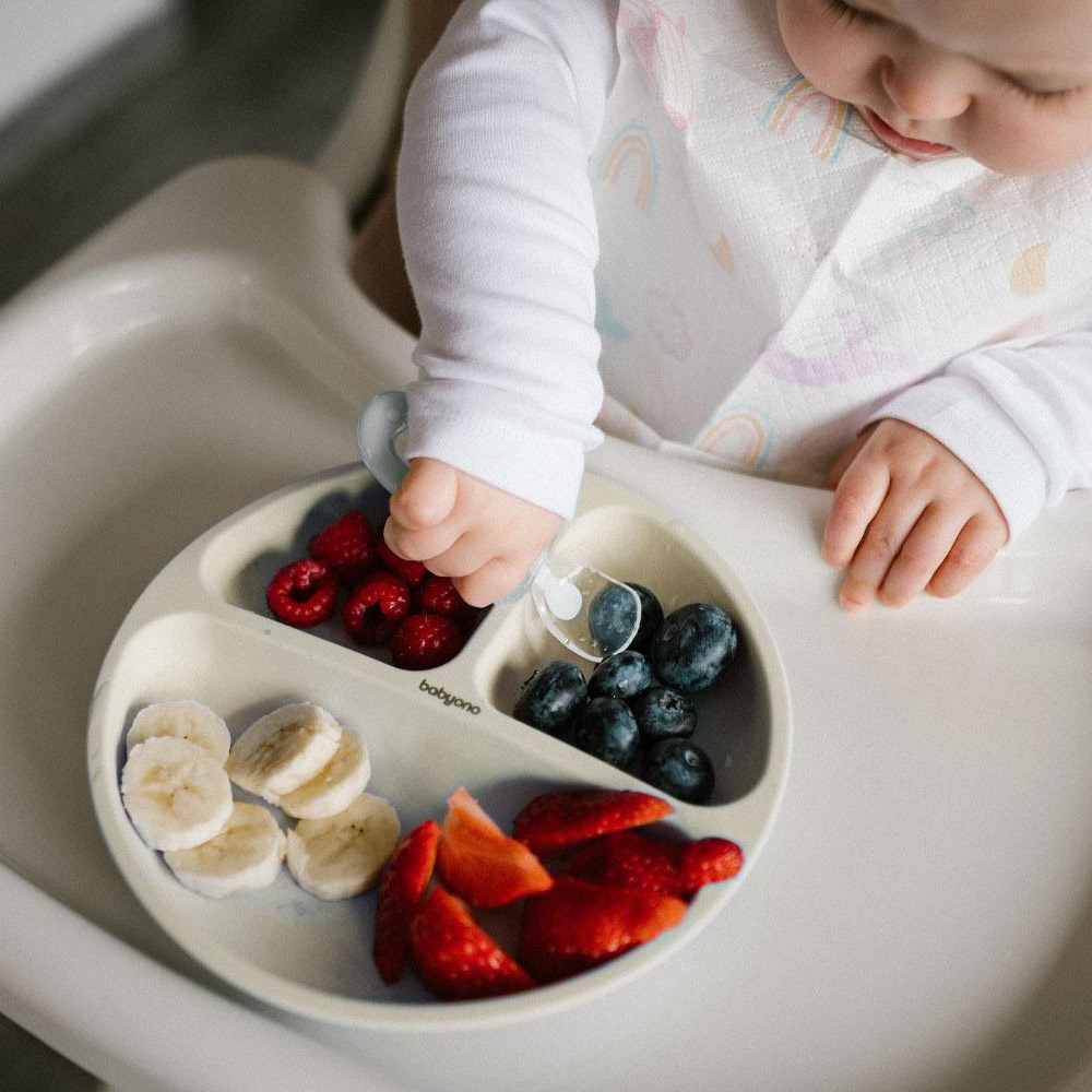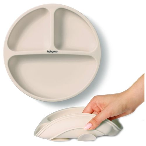 Talerzyk z przyssawką to idealne rozwiązanie podczas nauki samodzielnego jedzenia. Przyssawka minimalizuje ryzyko rozlania lub przewrócenia jedzenia. Ergonomiczny kształt ułatwia samodzielne nabieranie pokarmu.Trzy praktyczne przegródki zachęcają do zróżnicowanego jedzenia. Wykonany z wysokiej jakości silikonu, talerzyk jest bezpieczny dla zdrowia i łatwy w czyszczeniu. Można go myć w zmywarce i podgrzewać w mikrofalówce.