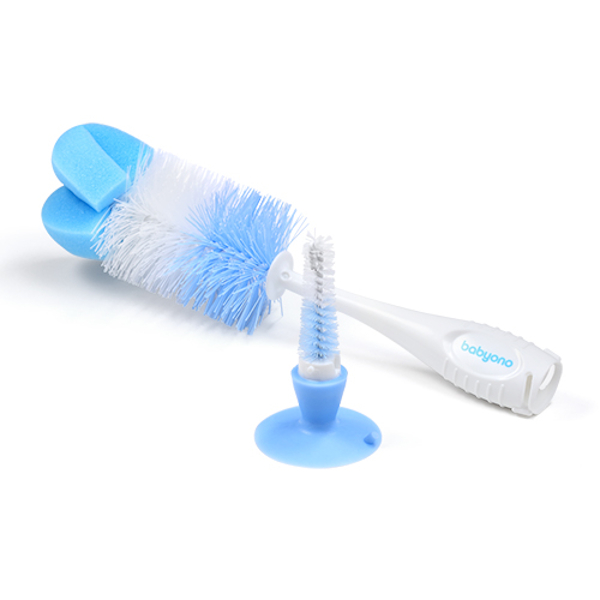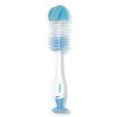 W uchwycie rączki jest schowana mała szczotka do czyszczenia smoczka. Miękkie włosie szczotek i gąbka docierają do trudno dostępnych miejsc. Szczotki wykonane są z trwałych i bezpiecznych materiałów, nie zawierających Bisfenolu A.