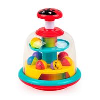 Wirująca zabawa w multikolorze! Wewnątrz bączka znajdują się 3 poziomy, a każdy z nich różni się zawartością. Dół bączka ozdobiony jest paseczkami kolorów, które wprawione w ruch, gubią odcięcia barw, łącząc się w jeden, wielokorowy pasek. Środkowy poziom bączka wyposażony jest w dwukolorowe piłeczki, wesoło podskakujące podczas kręcenia się bączka. Górny poziom zawiera jedną kuleczkę, która kręci się dookoła. Wciskaj tłok i baw się w najlepsze!