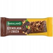 Baton zbożowy z kawałkami czekolady oraz polewą o smaku czekoladowym.