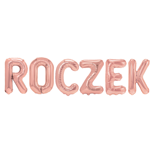 Balony tworzące napis ROCZEK w kolorystyce jak na zdjęciu.