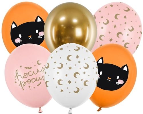 Balony Strong Hocus Pocus z nadrukami, zestaw zawiera 6 balonów (2 pastelowe w kolorze pomarańczowym z nadrukiem, 1 biały z nadrukiem, 2 pastelowe w kolorze Soft Pink z nadrukiem, 1 Glossy w kolorze złotym) średnica ok. 30 cm. (1 op. / 6 szt.)