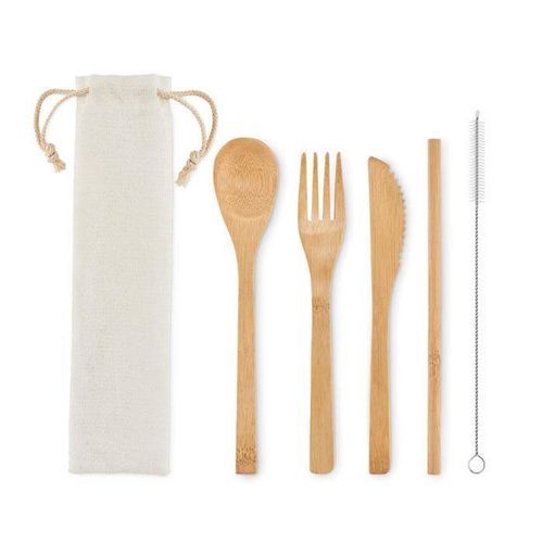 Zawiera nóż, widelec, łyżkę, słomkę z bambusa oraz szczoteczkę do czyszczenia ze stali nierdzewnej.